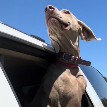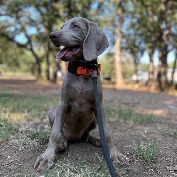 Mesa is quiet, confident, mild mannered, easy to handle, and smart. Her favorite past time is running with a natural hunting desire. She grew up running the open ranges in Wyoming, and now treks across Oklahoma country land. She is always running with her nose to the ground, alert, and looking for the new scents along the way. She likes to be the fastest in the pack, doesn’t matter if it’s a dog or a side-by-side. If the walk needs to be calm and less explorative, she is quick to be obedient on a leash. And not to much surprise, she also likes to run while on leash and continues to be submissive to the owners commands. If she is in a walk off leash, she likes to explore then come back to check in before she heads out to explore again. Mesa is smaller framed with an athletic build with typical Weim characteristics - a great tail set and beautiful stack. Mesa is happy to be independent but will make sure you know she’s there. She is great with children and loves to be around them, checking in on them while checking the surroundings, to make sure they are ok.